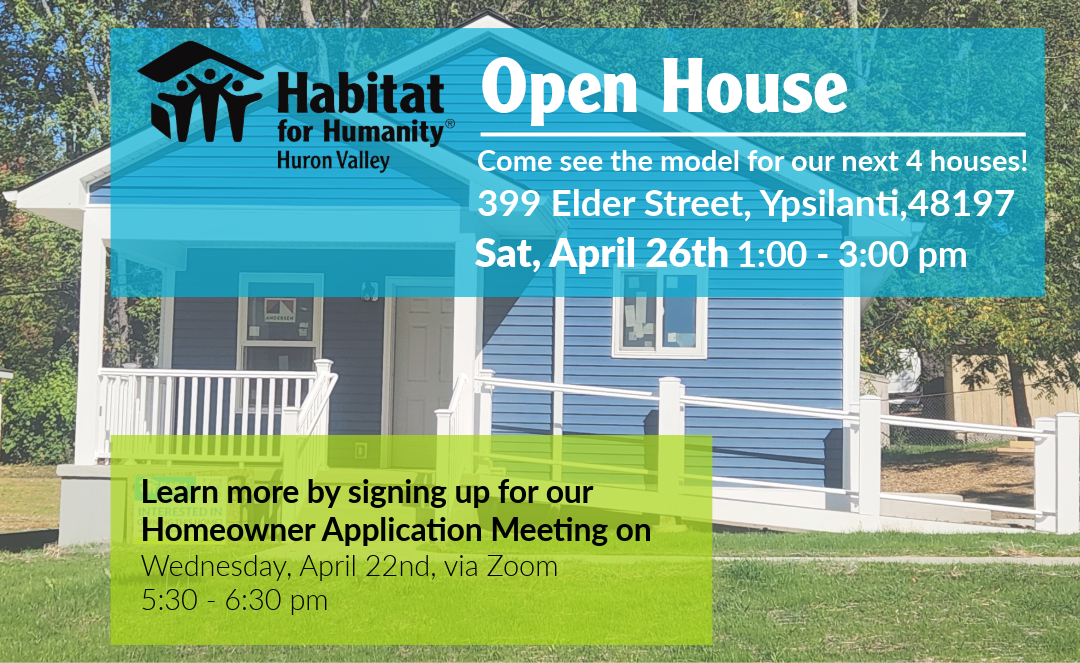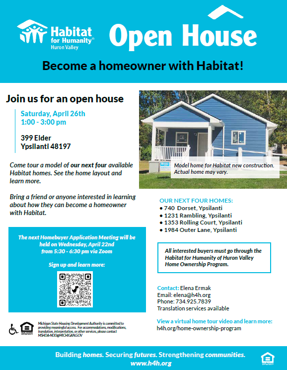 Then join us at an Open House on Saturday, April 26 from 1-3pm at 399 Elder St., Ypsilanti, 48197.